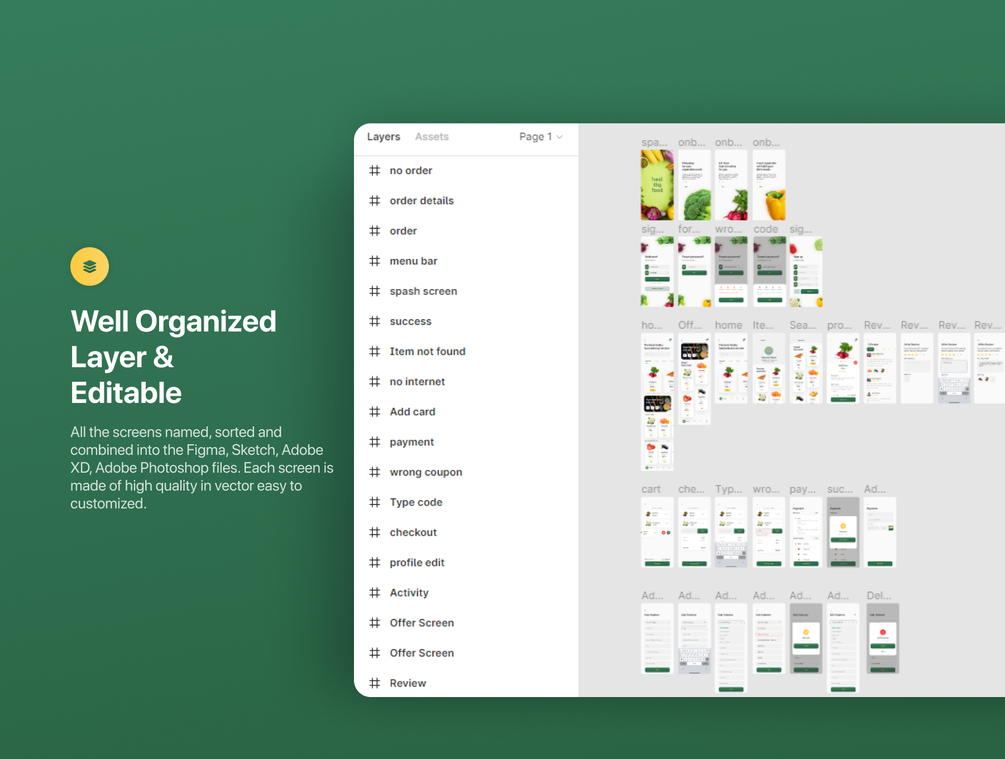 Package includes 45+ Screens in Figma, Adobe XD, Sketch, Adobe Photoshop files. Perfect tool to help you create Grocery App - Multipurpose E-commerce App.